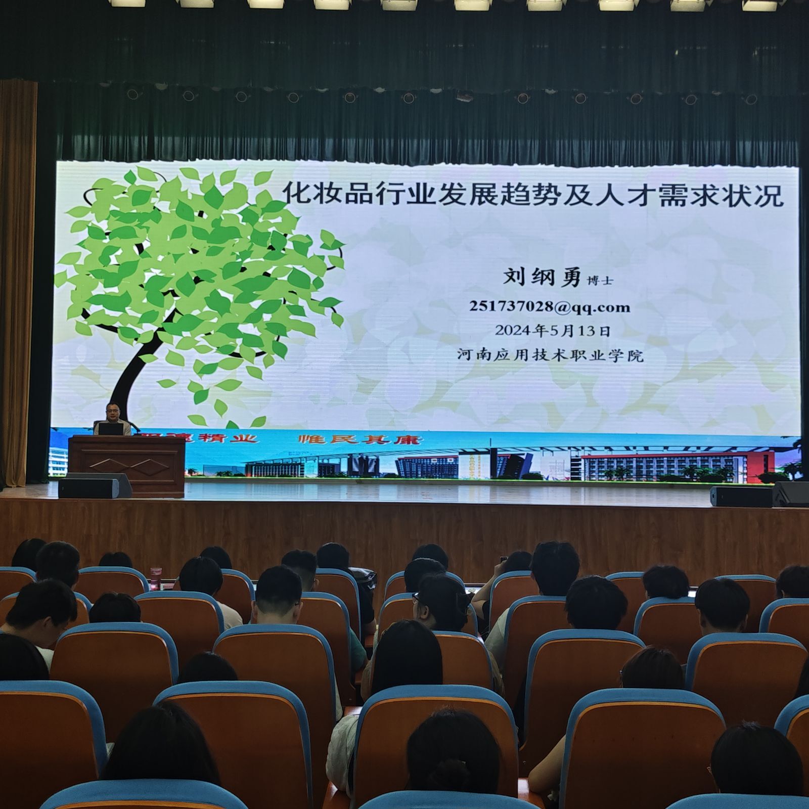 2024年5月14日,广东食品药品职业学院化妆品技术专业学科带头人、广东省化妆品科学技术研究会创始会长、全国轻工职业教育教学指导委员会日用化工专委会委员、全国药品职业教育教学指导委员化妆品专委会委员刘纲勇博士应邀来到万象城官网指导化妆品专业建设,并给化妆品经营与管理专业全体师生作了题为《化妆品行业发展趋势及人才需求》的专题讲座。