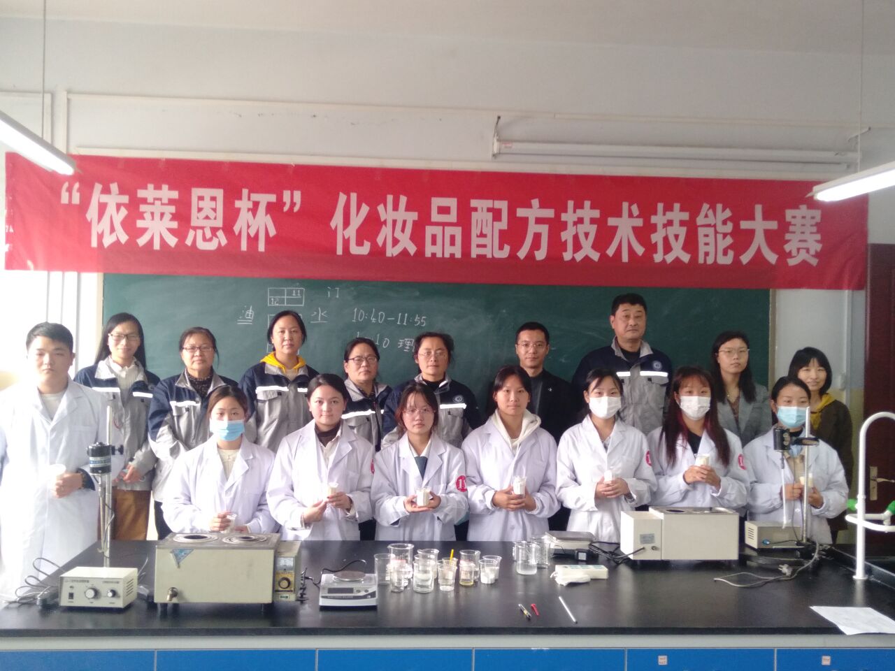 2021年10月23日,第一届“依莱恩杯”化妆品配方技术技能大赛在AWC万象城娱乐实训楼D楼成功举办。AWC万象城娱乐院长朱冰,郑州依莱恩生物科技有限公司经理袁少川,化妆品生产技术教研室全体教师出席本次大赛开幕式,共37名学生参加比赛。