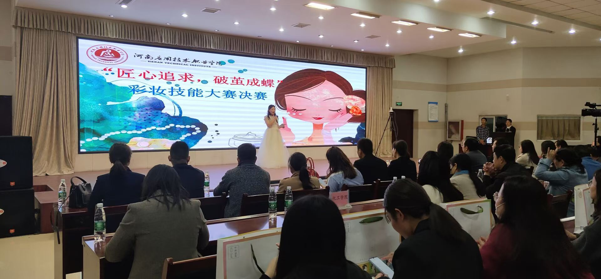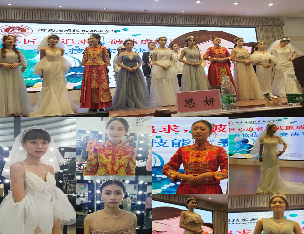本次比赛由我校AWC万象城娱乐承办,邀请上海惠润升生物科技有限公司、合肥思妍商贸有限公司、河南浦康好女人生物科技有限公司、郑州西蒙妮尔化妆品有限公司等六家省内外知名企业同时参与,来自全校各院系的共10支参赛队进入决赛,接受现场校企专家共同考评,比赛以“匠心追求,破茧成蝶”为主题,以“新娘妆妆容造型”为命题,要求选手在规定时间内完成作品并展示。