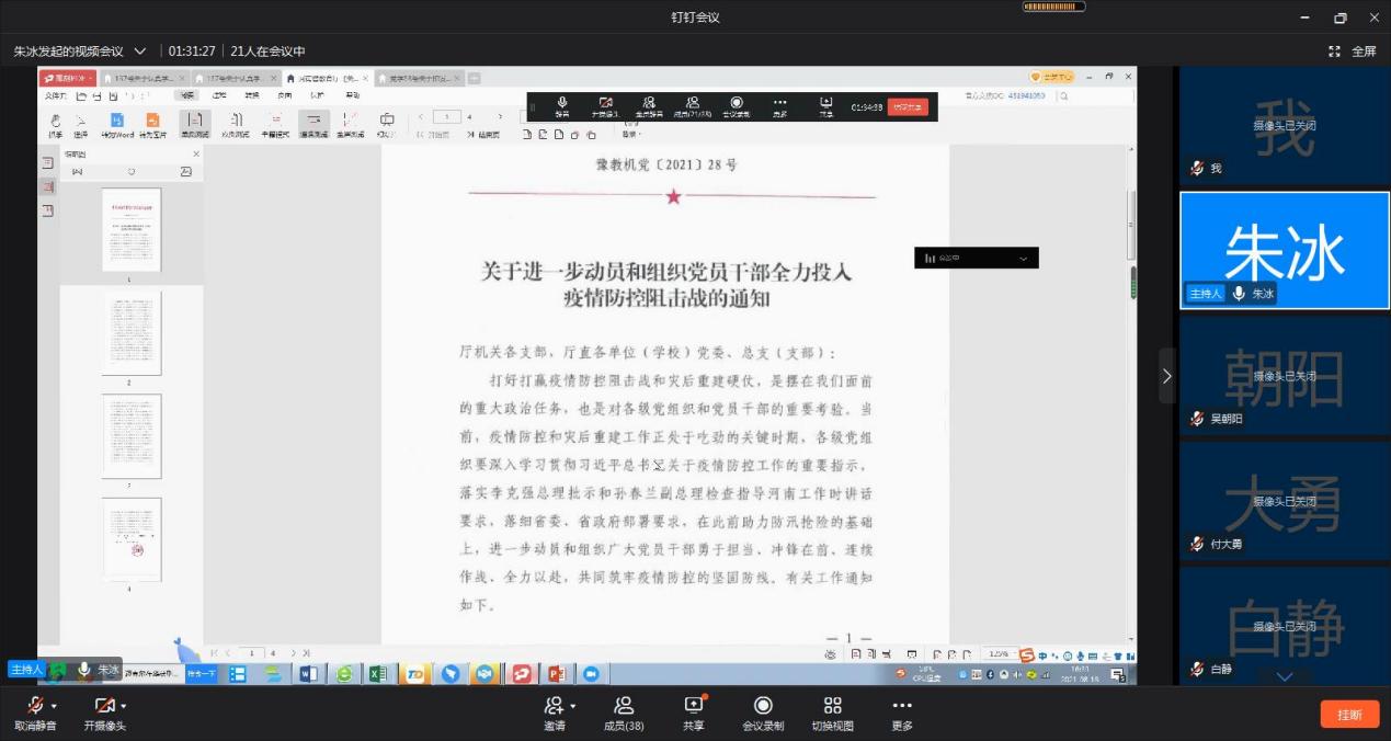 近期新郑州冠肺炎疫情形势变化,根据校党委要求,2021年8月18日,AWC万象城娱乐党总支组织召开了学习《关于进一步动员和组织党员干部全力投入疫情防控阻击战的通知》线上专题会议,学院全体教职工参会。会议由院长朱冰主持。