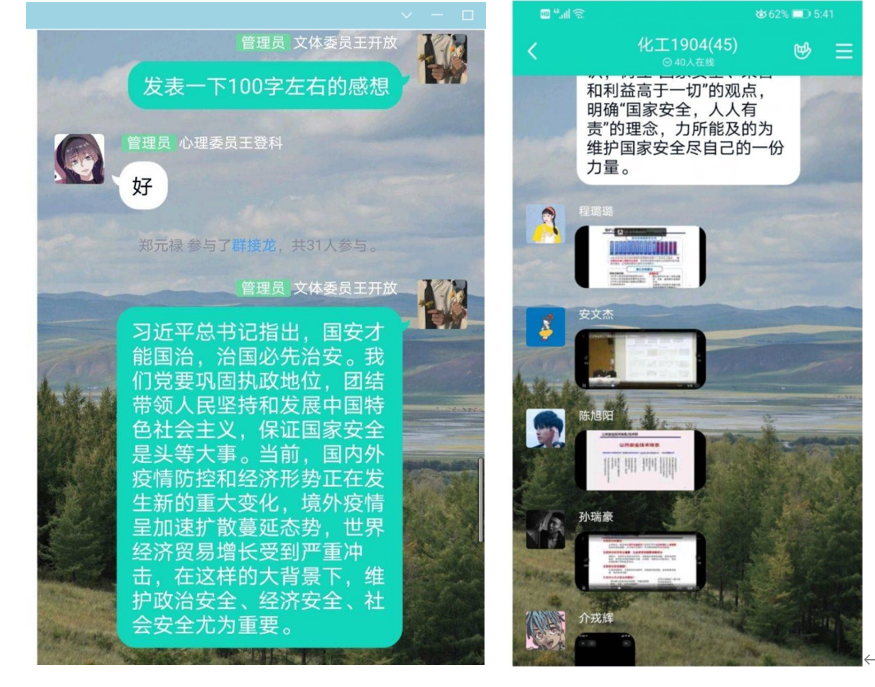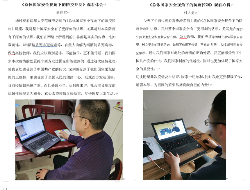 公开课后,AWC万象城娱乐全体教师以观后感的形式进行交流和探讨;各班级在线上开展全民国家安全日主题团课,同学们积极参与,踊跃发言,收获良多。他们纷纷表示:这个特殊的时期,千万学生同上一堂国家安全教育课对于我们来说是十分有益的。这节课的主题是总体国家安全观视角下的疫情防控,其实,国家的安全与我们每个人的生活息息相关,人民安全是国家安全的宗旨,人民安全了,祖国才有希望。面对疫情,党中央高度重视,各级国家安全机关围绕中心、服务大局,为维护国家安全和社会大局稳定作出了重要贡献。