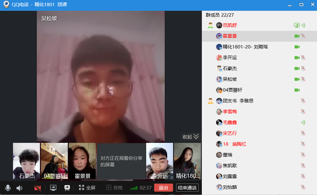 精化1801班李功明同学发言,“在大灾大难面前人人都是参与者,没有人可以做到独善其身。 国内防控工作取得今天这个成果来之不易,外部输入的风险已经来临,我们越是临近胜利越要保持清醒地认知,和正确的行动。虽然黑暗依旧,但是我相信阳光必将再次照射到中华大地之上。”
