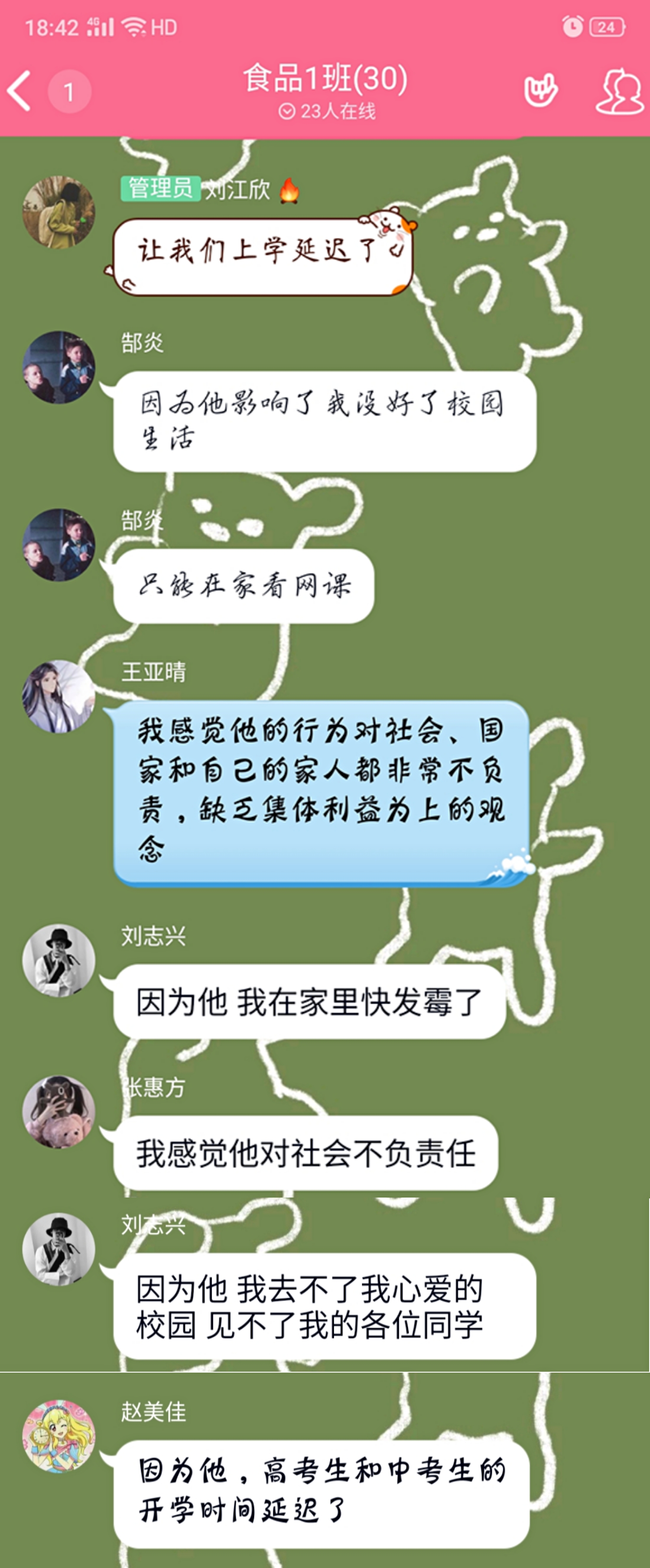化工学院全体学生参与了此次活动,阐述了自己的观点。大部分同学都能认识到郭某的行为体现了一种不负责的自私意识,行为本身为社会带来了极大的物质损失及管理压力,为他人带了感染风险和心理恐慌。大部分同学都认识到作为新时代青年应该有所担当,做文明青年。