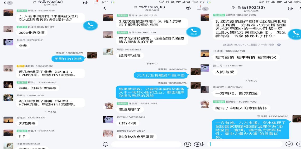 四位教授将疫情防控工作涌现的案例转化为鲜活课堂,既蕴含丰富的理论知识,又与新时代疫情防控的责任担当紧密结合,引发观看师生的强烈共鸣和热议。“通过学习,对中国共产党果断决策和和防控疫情、习近平总书记对本次疫情的科学决策、各级党组织参与疫情的防控积极性、我国医护人员的无私奉献、我国人民的服从大局意识,这些都体现了我党集中统一领导的显著优势。”蔡庄红书记谈及抗疫一线涌现出的动人故事深深感动着广大师生,传递出满满的正能量。付大勇老师说到:面对疫情这场不见敌人的战役,不论是90后还是00后,都体现出了勇于担当,不畏艰难的大无畏精神,这也说明了我们教育的成功。“作为当代大学生,我们的内心也是五味杂陈。看到了无数的人已悄然离开人间,见证了难过,沮丧,艰辛……但看了今天的讲座,让我很自豪的是我是中国人,生活在一个富强的国家,她的博大,责任与担当保护着我们每一个人,正所谓生于种花家,何其荣幸。”李功明同学观看完思政课,在之后的班会中发言到。