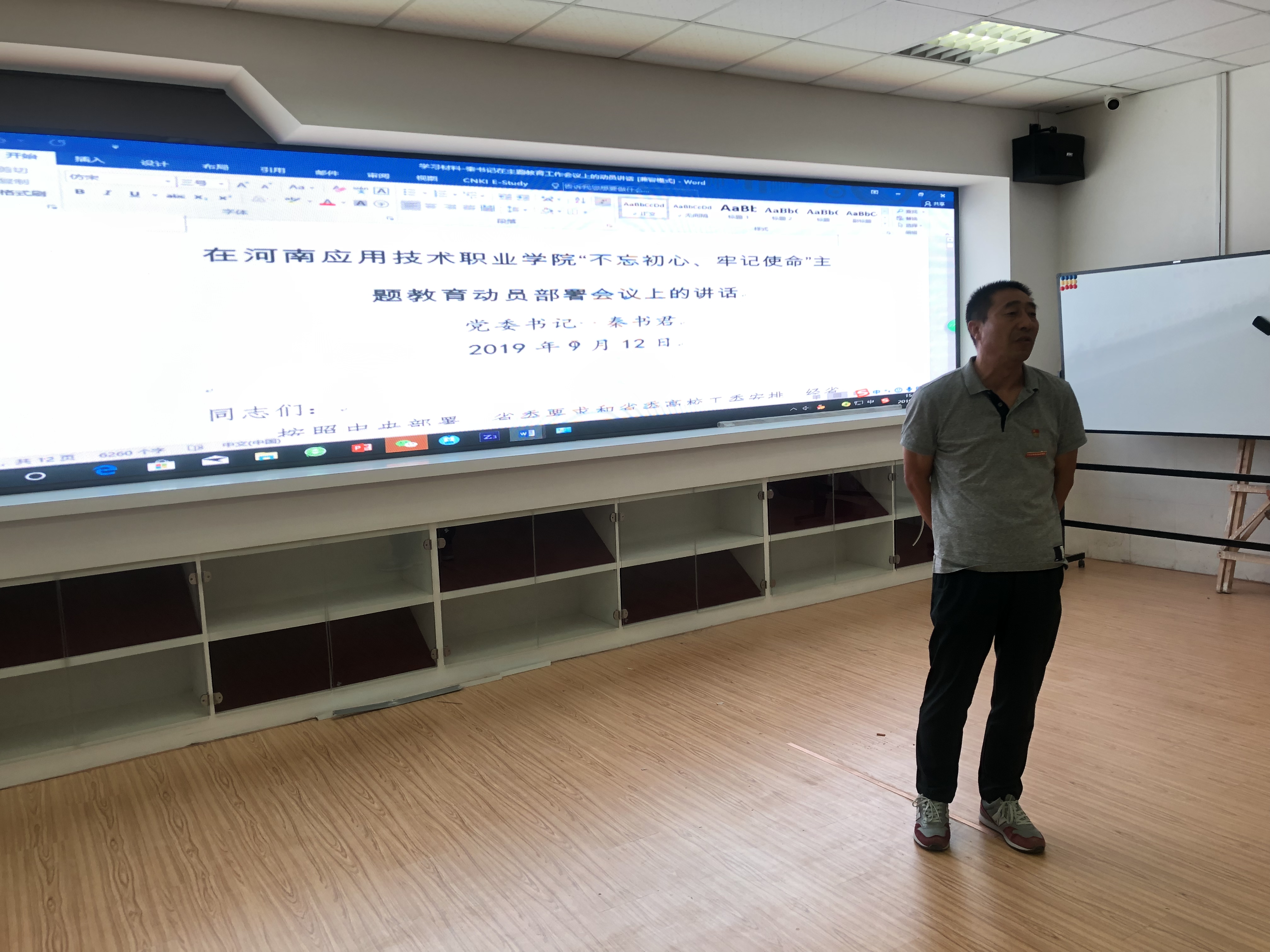 2019年9月17日,AWC万象城娱乐党总支组织教工、学生支部在实训楼创意馆召开召开“不忘初心、牢记使命”主题教育工作动员会。会议中,两个支部按照总支动员工作要求,分别按照学习文件、学习讲话精神和活动动员三个步骤开展。会上,支部书记领学了《习近平在“不忘初心、牢记使命”主题教育工作会议上的讲话》、《AWC万象城娱乐“不忘初心、牢记使命”主题教育工作实施方案》、校党委书记秦书君同志《在AWC万象城娱乐“不忘初心、牢记使命”主题教育动员部署会议上的讲话》,阐述了全党加强“不忘初心、牢记使命”主题教育的重要意义。最后通过对文件的分析,明确了党员干部在教育工作中要实现的目标,将全体党员思想统一到“守初心、担使命,找差距、抓落实”的总要求上来。
