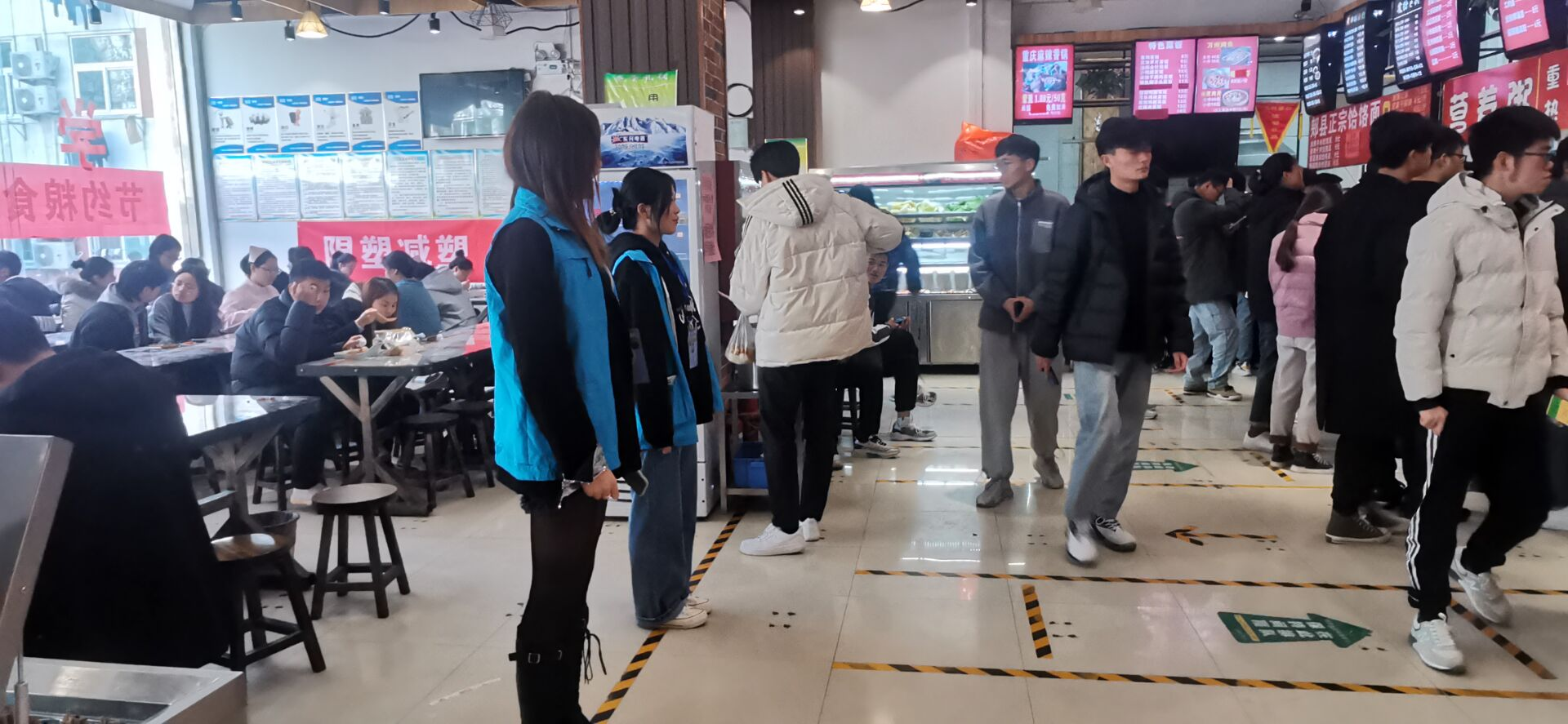 活动中,志愿者们统一穿着马甲、佩戴工作证,精神饱满地为师生提供志愿服务。积极引导大家按食堂进出口标识进出;在就餐高峰期,提醒师生按照地面“一米线”标识有序排队取餐;用餐结束后,提醒大家将餐具送至回收处等,这些身影成为应院食堂一道亮丽的风景线。