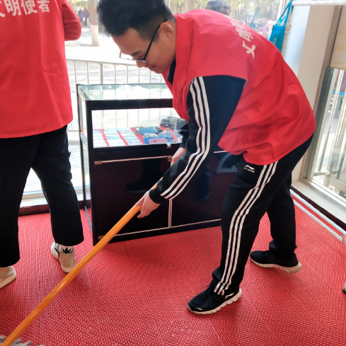 下午两点,志愿者到达五一公园,身穿红色马甲,拿起清洁工具帮助“学雷锋志愿服务站”打扫站点卫生,擦拭标语牌,捡拾路边垃圾。