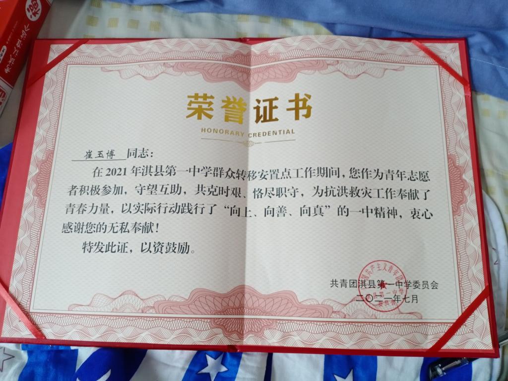在2021年的抗洪过程中,在淇县第一中学群众转移安置点为受灾群众搬运物资,为他们分发物资,受到当地群众的赞扬。她表示,在此次志愿活动中,我也学到很多东西,我相信学到的这些东西对以后的工作和生活中都是很有帮助的。